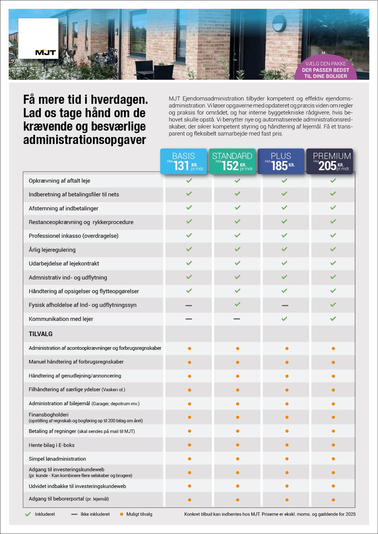 Hos MJT Rådgivning administrerer vi egne og eksterne udlejningsejendomme. Vi tilbyder en administration, tilpasset dit eksakte behov, således du kun betaler for det du ønsker. Vil du eksempelvis selv stå for kontakt til dine lejere, men gerne ud af den administrative del med opkrævninger, lejereguleringer, restancer etc., kan vi lave en aftale tilpasset specielt til dig.